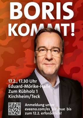 Am Dienstag, 17. Februar 2026, kommt der Bundesverteidigungsminister Boris Pistorius nach Kirchheim unter Teck. Er begleitet den SPD-Spitzenkandidaten und Landesvorsitzenden Andreas Stoch im Rahmen seiner „Tour für Dich“.